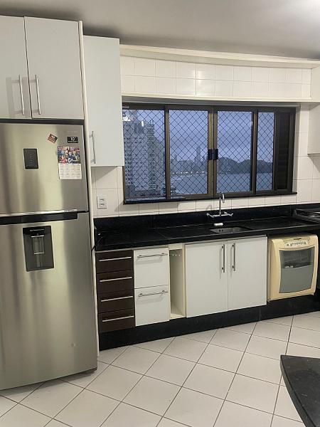 Apartamento para aluguel anual, com 280 m² de área privativa, 04 suítes, 5 banheiros, churrasqueira na sacada, 2 vagas de garagem privativas, vista total da praia, andar alto, sem mobília, apenas na cozinha.