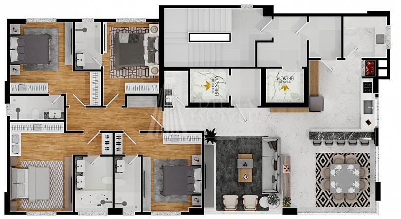 170m² de Área Privativa, 04 Suítes, Amplo Living Integrado, Lavabo, Churrasqueira à Carvão e 03 Vagas de Garagem.